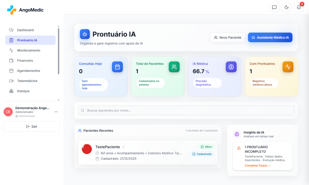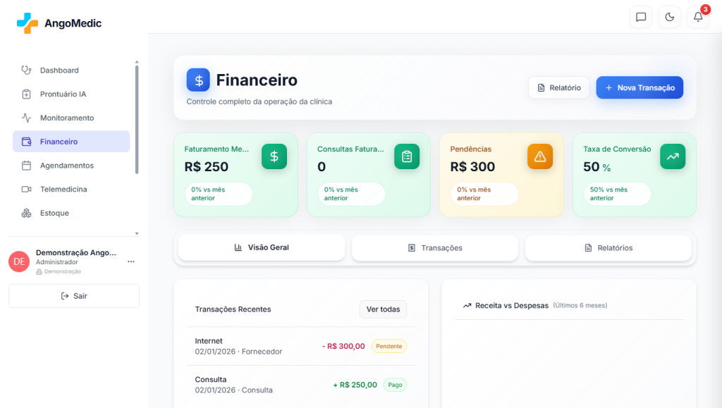 Controle total da agenda, finanças e operação em um só lugar com Angomedic. A primeira plataforma médica com IA que realmente entende sua rotina.